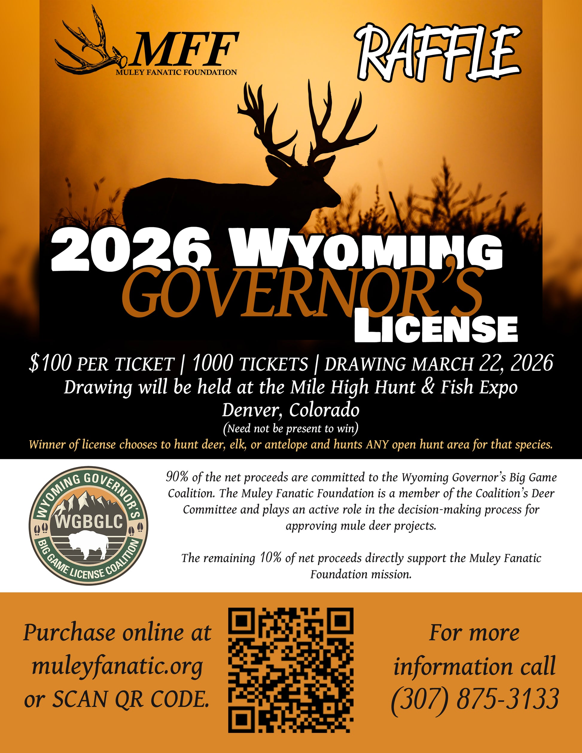 90% of the net proceeds are committed to the Wyoming Governor’s Big Game Coalition. The Muley Fanatic Foundation is a member of the Coalition’s Deer Committee and plays an active role in the decision-making process for approving mule deer projects. The remaining 10% of net proceeds directly support the Muley Fanatic Foundation mission.